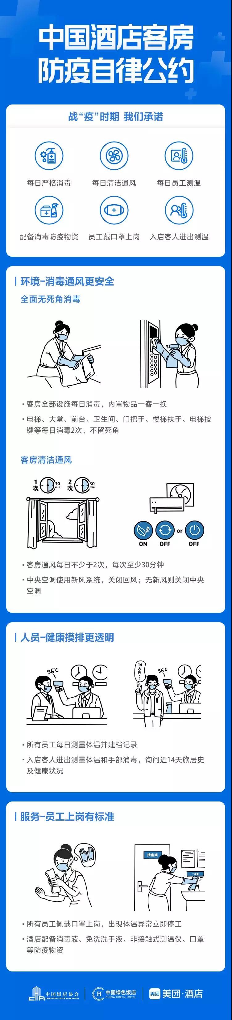 加入《公約》后,所有人均可以通過美團APP查到酒店預訂首頁帶有“安心住”的標簽以及按照防疫標準每日開展的防疫清潔記錄。后續門店復工后,也將同步遵照公約執行,讓顧客可以放心預訂,安心入住。